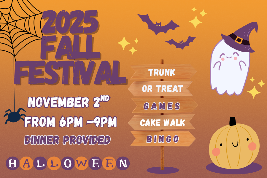 Invite your friends & family, bring your grandkids, tell your neighbors! Our annual Fall Festival is a blast! There will be a TRUNK OR TREAT starting at 6pm, dinner, games, a cake walk, & bingo with a variety or prizes. SEE YOU THERE!
