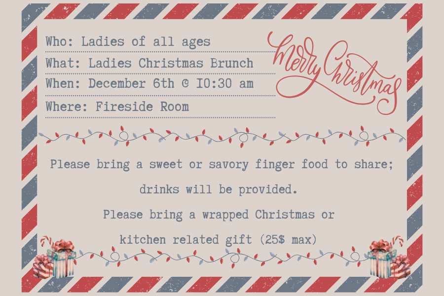 Ladies of all ages are invited to our annual Christmas get together. This year we are having a brunch!! Please bring a sweet or savory finger food to share; drinks will be provided. Also, bring a wrapped Christmas or kitchen related gift (25$ max) for our Christmas gift exchange.