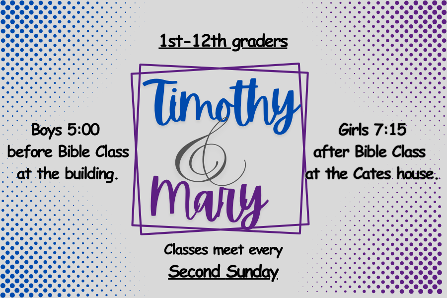 First through 12th graders meet together once a month to study God's word and learn about serving in the Lord's church. This is a great opportunity for our children. See Logan or Summer Cates for more details.