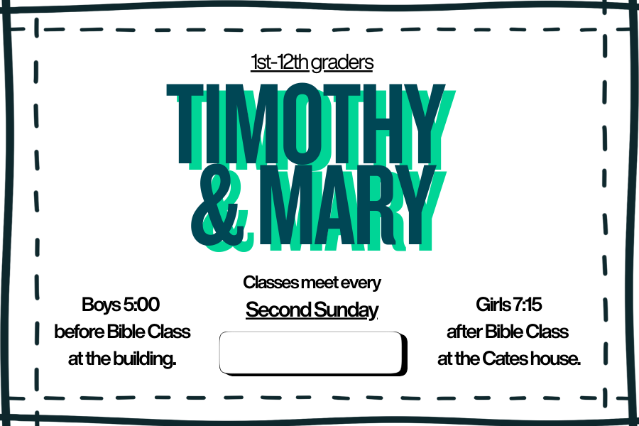 First through 12th graders meet together once a month to study God's word and learn about serving in the Lord's church. This is a great opportunity for our children. See Logan or Summer Cates for more details.